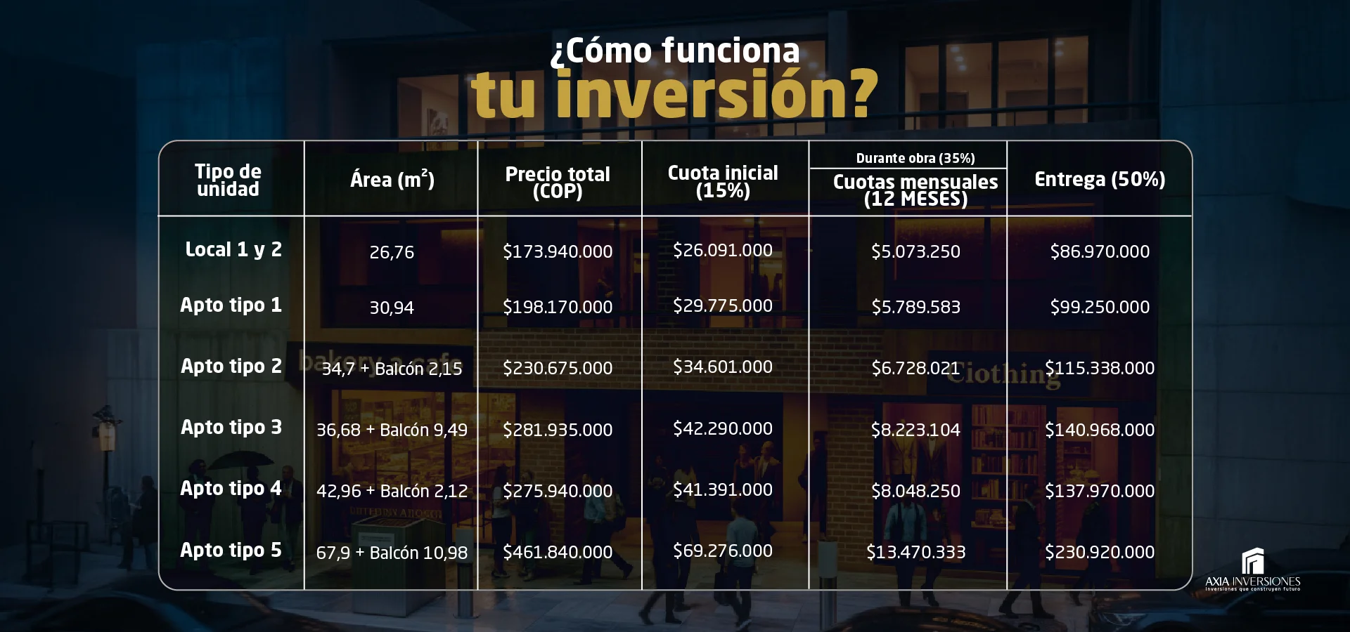 *Cifras proyectadas; pueden variar según mercado, ocupación y operación del activo. Proyecto sin fiducia; pagos respaldados con contrato e hitos de obra.
